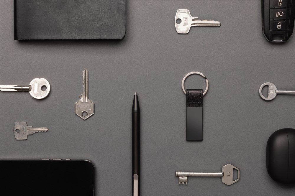 Schicker PU Schlüsselanhänger aus RCS recyc. Zinklegierung