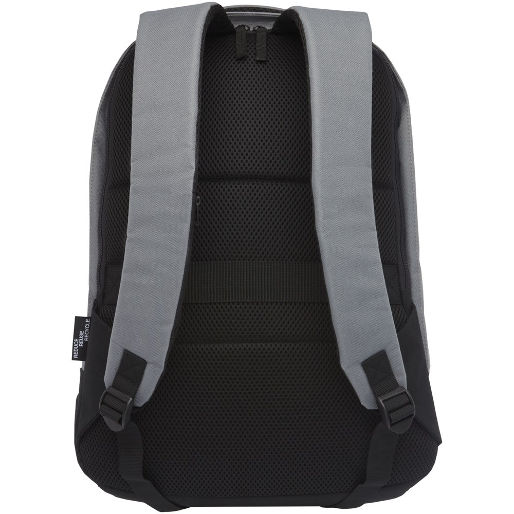 GRS zertifizierter Rucksack, ausgestattet mit einem offenen Hauptfach mit Ordnungsfach, gepolsterter 15" Laptophülle und 2 Taschen mit RFID-Schutz. USB-Port auf der rechten Seite zum einfachen Anschließen und Laden von Geräten aus dem Innenraum. Mit gepolsterten Schultergurten, rechtem Schultergurt, versteckter Reißverschlusstasche, Haltegriff und Trolley-Durchgriff. Für die Herstellung dieser Tasche werden ca. 15 Kunststoffflaschen recycelt.