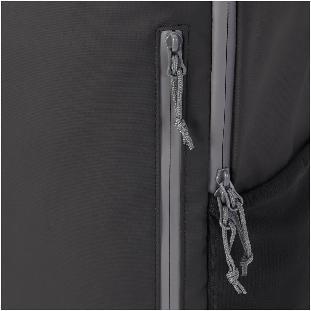 Wasserabweisender Laptop-Rucksack aus GRS-zertifiziertem Recyclingmaterial, einschließlich der Reißverschlüsse. Er verfügt über ein gepolstertes 15" Laptopfach mit seitlicher Öffnung für schnellen Zugriff, mehrere Netztaschen, eine Fronttasche mit Reißverschluss und reflektierende Paspeln für bessere Sichtbarkeit. Das geformte und gepolsterte Rückenteil sowie der verstellbare Brustgurt sorgen auch bei voller Beladung für hohen Tragekomfort. Der Hauptstoff, das Futter, die Gurte und die Reißverschlüsse bestehen aus recyceltem GRS-Material. Kapazität: 21 Liter. PVC frei.