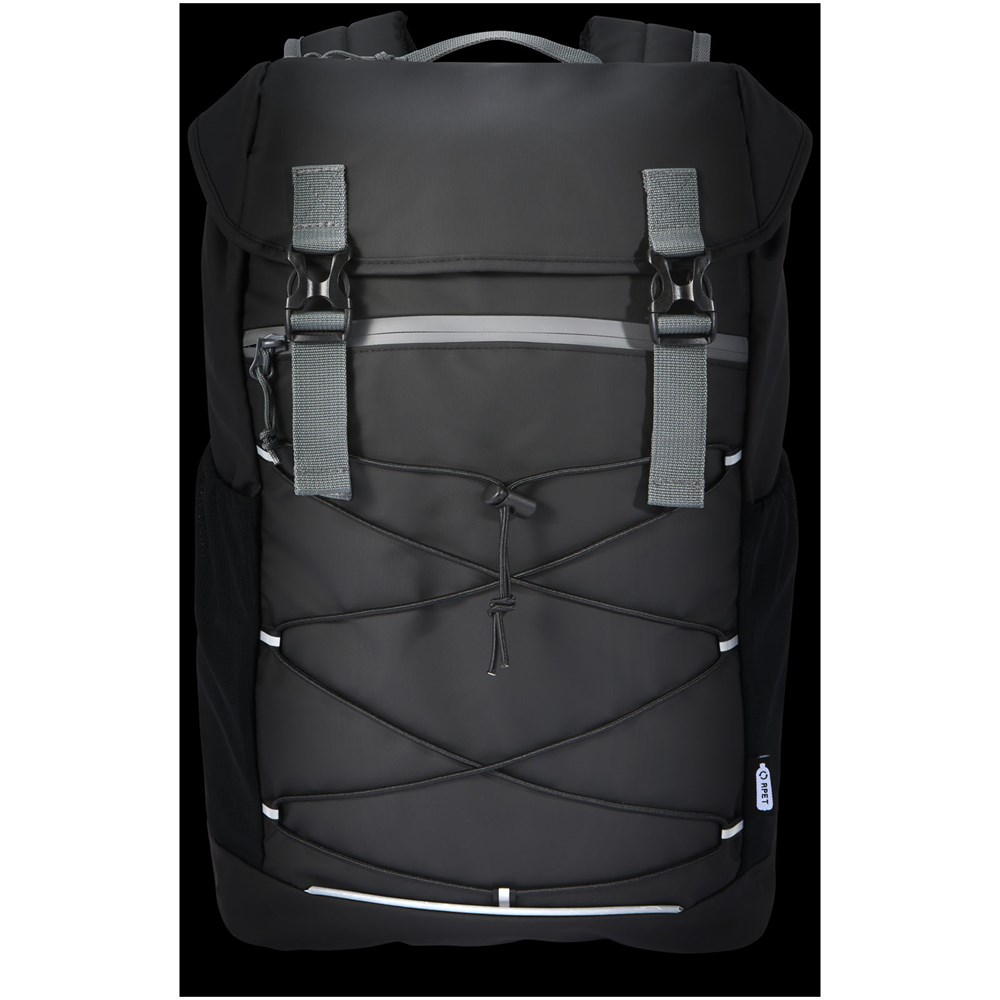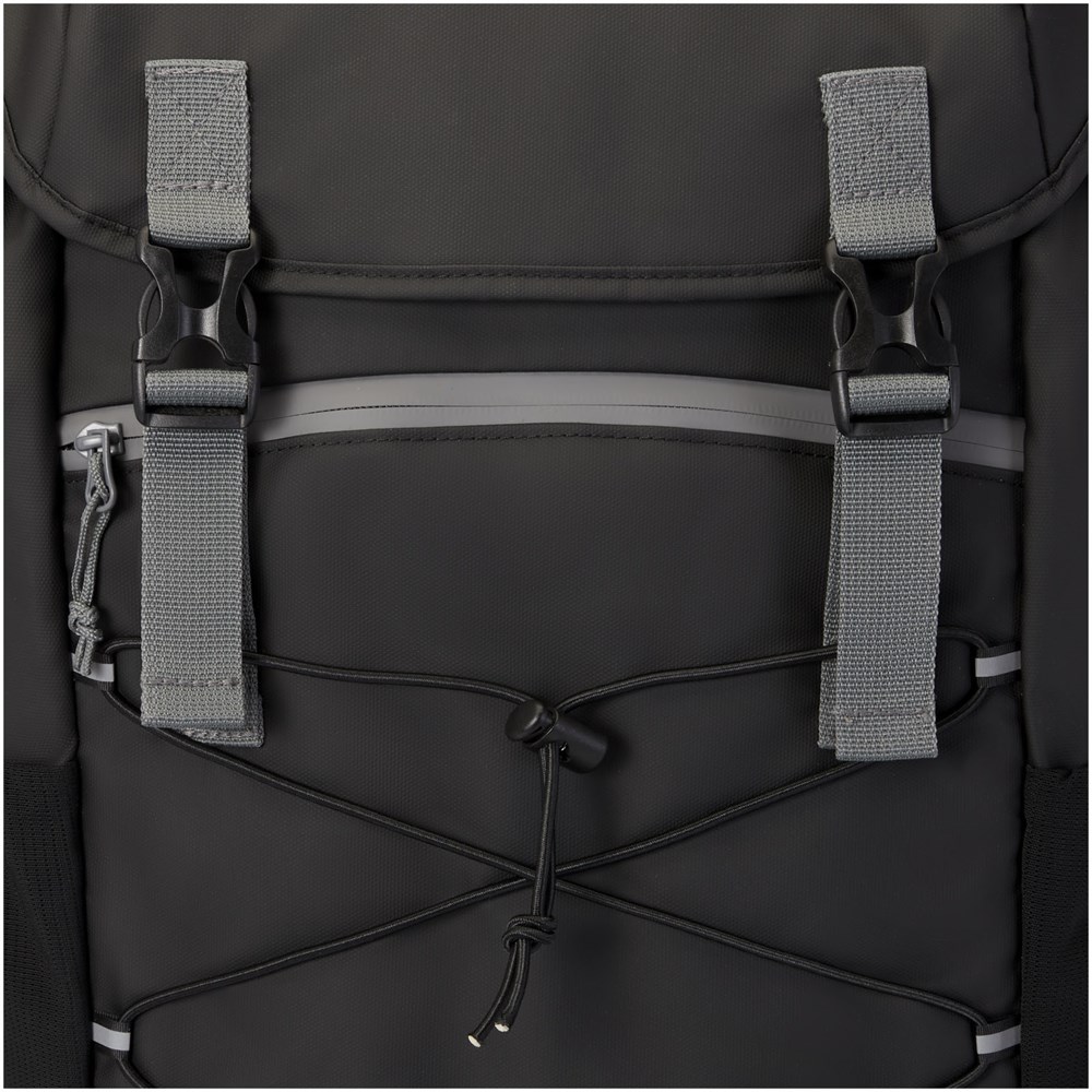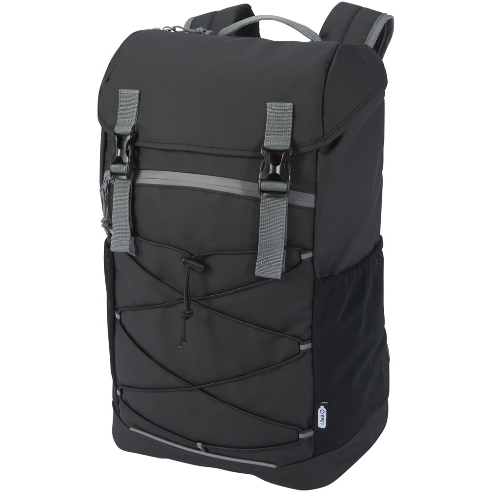 Wasserabweisender Laptop-Rucksack aus GRS-zertifiziertem Recyclingmaterial, einschließlich der Reißverschlüsse. Er verfügt über ein geräumiges 15,6" Laptopfach mit Kordelzug und verstellbaren Schnallen, um den Stauraum unter dem Klappdeckel zu maximieren. Der Rucksack hat mehrere Taschen, darunter eine Fronttasche mit Reißverschluss und elastischen Kordeln zum Verstauen und Organisieren, sowie reflektierende Paspeln für bessere Sichtbarkeit. Das geformte und gepolsterte Rückenteil sowie der verstellbare Brustgurt sorgen auch bei voller Beladung für hohen Tragekomfort. Der Hauptstoff, das Futter, die Gurte und die Reißverschlüsse bestehen aus recyceltem GRS-Material. Kapazität: 23 Liter. PVC frei.