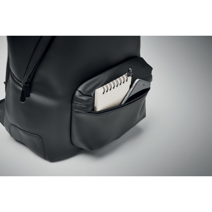Rucksack aus weichem PU. 15'''' Laptop Fach. Fronttasche mit Reißverschluss. Gepolsterter Rücken und verstärkter Boden. Futter aus 210D RPET.