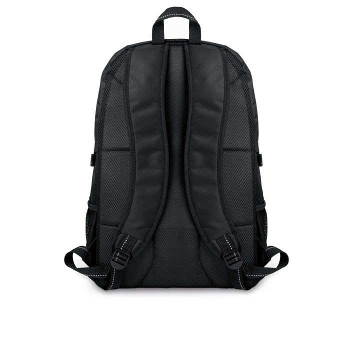 Laptop Rucksack aus 600D Polyester mit Ripstop Details. Inklusive einem 15'' Laptop Innenfach, Fronttasche mit Reißverschluss und 2 Seitenfächern. Verstellbarer Schultergurt.