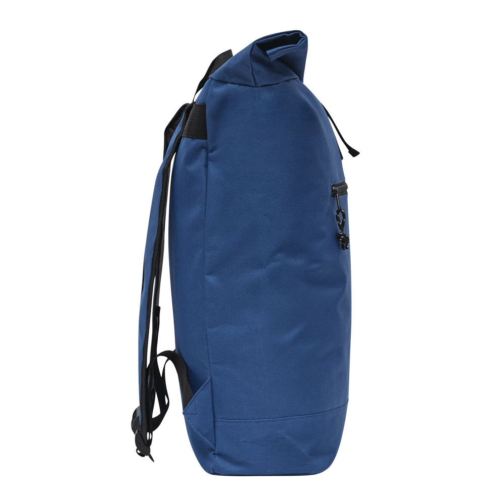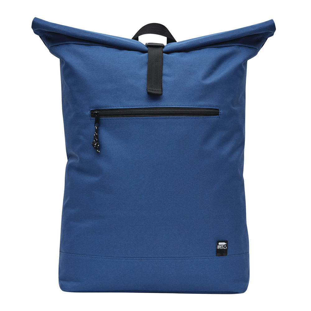 Rucksack ROLL-TOP: aus recyceltem Kunststoff (RPET), horizontales Reißverschluss-Vorfach, großes Hauptfach mit gepolstertem Innenfach für Laptop oder Tablet, aufrollbar und mit Schnappverschluss verschließbar, Trageschlaufe, gepolsterter Boden, Schultergurte und Rückenbereich