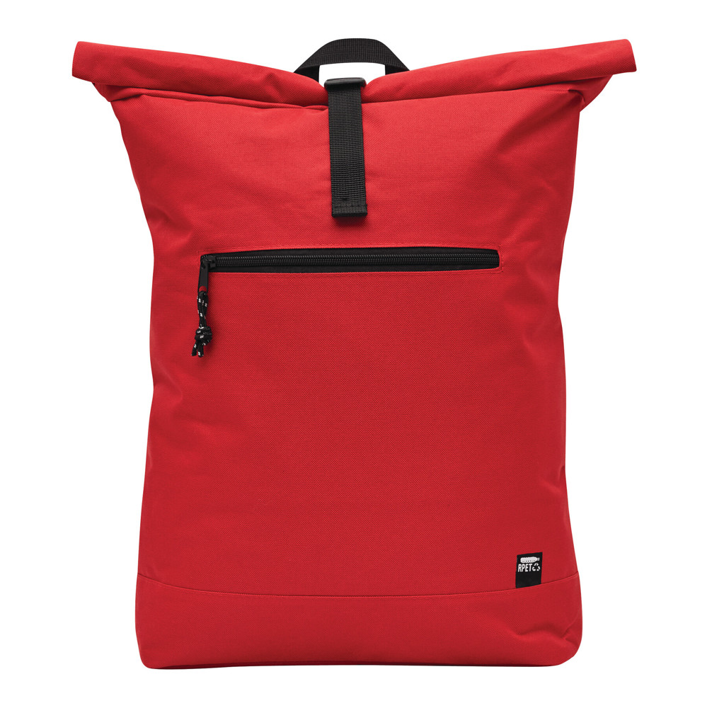 Rucksack ROLL-TOP: aus recyceltem Kunststoff (RPET), horizontales Reißverschluss-Vorfach, großes Hauptfach mit gepolstertem Innenfach für Laptop oder Tablet, aufrollbar und mit Schnappverschluss verschließbar, Trageschlaufe, gepolsterter Boden, Schultergurte und Rückenbereich