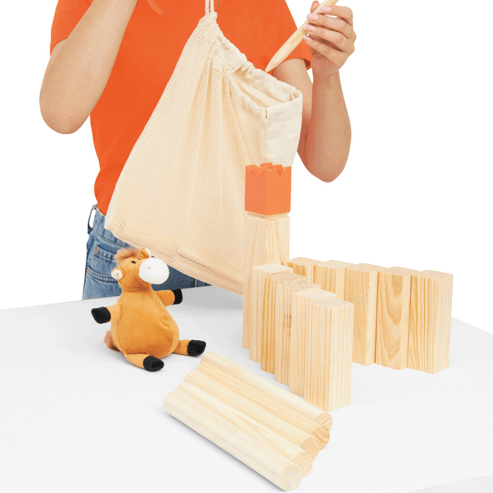 Wikinger Wurfspiel KUBB aus Holz: 1 König, 4 Eckpfosten, 10 Holzblöcke und 6 Wurfhölzer, inkl. Baumwollbeutel, Outdoor-Geschicklichkeitsspiel für 2-12 Spieler, in Box