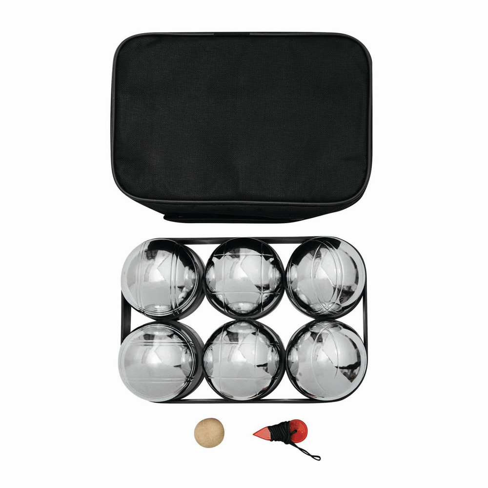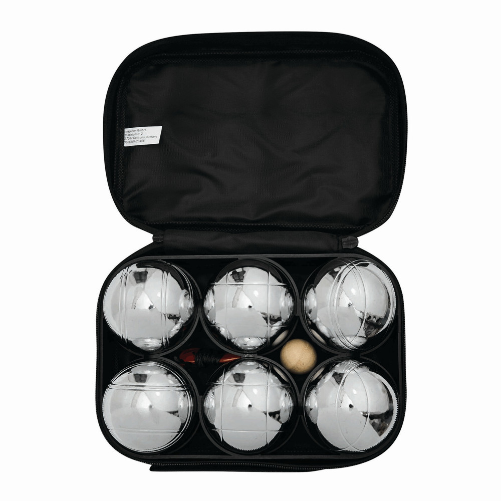Boulespiel GOLIATH: bestehend aus 6 Metallkugeln, Holzkugel und rotem Messfaden, im schwarzen Reißverschlussetui