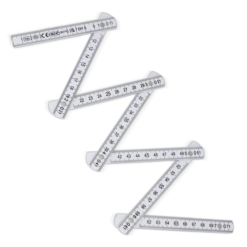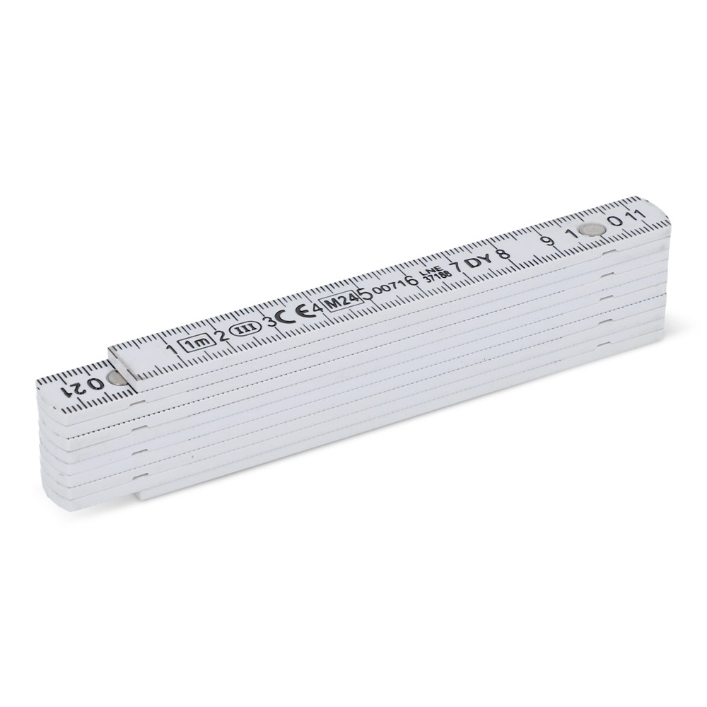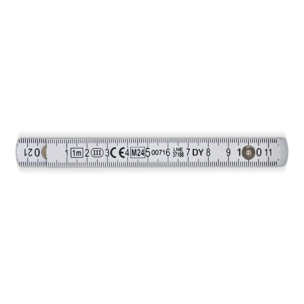 Kalibrierter Zollstock mit einer Gesamtlänge von 1 Meter. Dieser Maßstab entspricht der Europäischen Messgeräterichtlinie (MID 2014/32/EU), Klasse 3. Das bedeutet, dass der Zollstock gemäß den europäischen Richtlinien für hohe Messgenauigkeit zertifiziert ist.