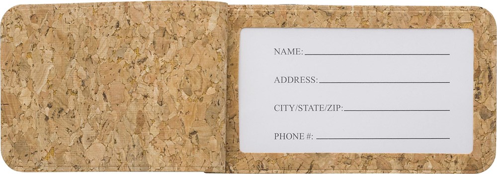 Gepäckanhänger aus Kork mit Gummiband. Karteneinschub für persönliche Daten (Name, Adresse, Stadt/Staat und Telefonnummer). Einzeln verpackt im Polybeutel.