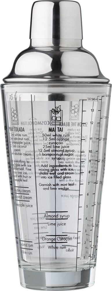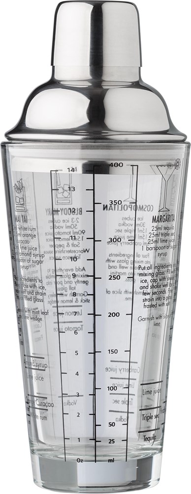 Cocktailshaker aus Glas (400 ml) mit Deckel aus Edelstahl (s/s304). Cocktailrezepte auf der Seite aufgedruckt. Einzeln verpackt in einer braunen Kartonbox.