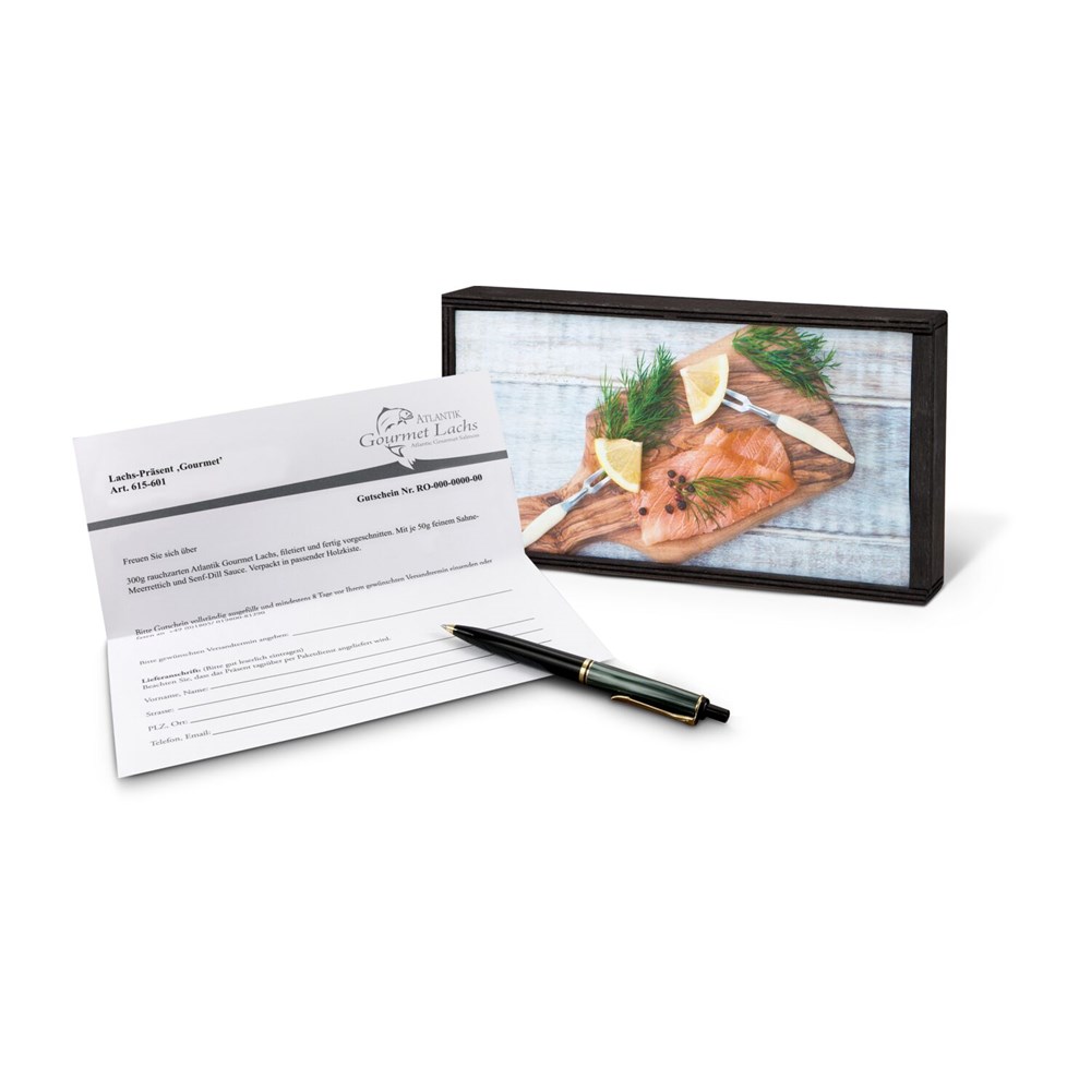 Gutschein für 300 g rauchzarten Atlantik Gourmet Lachs, filetiert und fertig vorgeschnitten, kombiniert mit feinem Sahne-Meerrettich und einer Senf-Dill Sauce, je 50 g. Dieser Lachsgutschein wird hochwertig präsentiert in einer schwarzen Holzkiste mit stimmungsvollem Deckelaufleger. Der Beschenkte kann dann selbst bestimmen, wann und zu welchem Anlass er sein exklusives Lachspräsent frisch geliefert bekommen möchte. Wir versenden das kulinarische Geschenk pünktlich zum Wunschtermin (Einlösung erfolgt über eine neutrale Webseite). Die angegebenen Preise beinhalten neben dem Präsent auch die Erstellung des Gutscheins, zzgl. für die Einzelversandzustellung bei den Beschenkten.