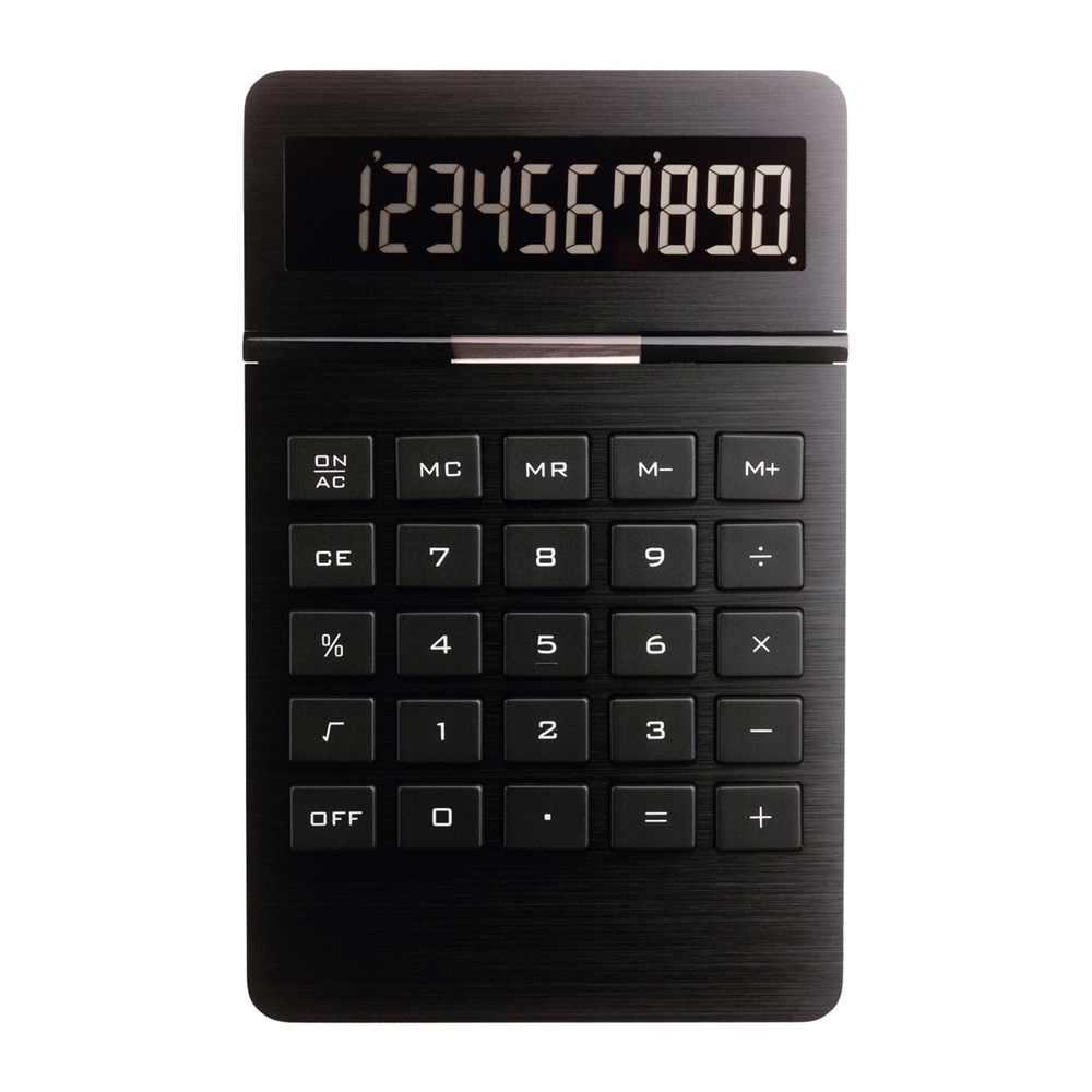 Ideal für den Schreibtisch als edler Hingucker mit praktischem Nutzen. Unser hochwertiger Taschenrechner aus mattschwarzem Metall verfügt über eine Solarfunktion. Das Display zeigt 10 Stellen und Batterien sind im Lieferumfang enthalten. Eine Veredelung kann mit 1c-Tampondruck erfolgen oder als hochwertige Lasergravur.