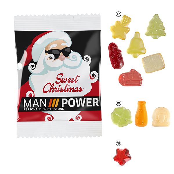 Inhalt: 1. Premium-Bärchen | 2. Nostalgie-Cars | 3. Sparkassen-S (nur roter Fruchtgummi/nur für Sparkassen) | 4. Telefonhörer | 5. Handy | 6. Werkzeuge | 7. Herzen (nur roter Fruchtgummi) | 8. Flugzeuge | 9. Brille | 10. Silvester (nur saisonal erhältlich) | 11. Schweinchen | 12. Weihnachten (nur saisonal erhältlich) | 13. Ostern (nur saisonal erhältlich) | 14. @ | 15. Smilegummi (nur gelber Fruchtgummi) | 16. § | 19. Fisch | 20. Haus | 21. LKW | 22. Buch | 23. Kleeblatt | 24. € | 25. Sternchen | 26. Teddy-Bärchen | 27. Super-Mini-Bärchen | 28. Fahrradfahrer | 29. Zahn | 30. Glühbirne | 34. Sonne | 35. Blume | 36. Auto | 38. Schiff | 39. Motorrad | 40. Daumen hoch | 41. Fußballfieber | 43. Halloween (mit künstlichen Farbstoffen) (nur saisonal erhältlich) | 44. Bus | 45. Jogging-Schuh | Weihnachten: Zimtfrüchtchen (rot) (nur saisonal erhältlich) | Weihnachten: Glühweinsterne (rot) (nur saisonal erhältlich). Haltbarkeit: ca. 6 Monate bei sachgerechter Lagerung. VE/Karton: 500 Stück. Lieferzeit: ca. 15 Arbeitstage nach Druckfreigabe.