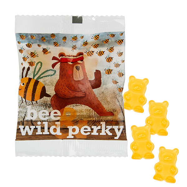 Fruchtgummi-Bärchen mit echtem Blütenhonig, natürlichen Aromen und färbenden Lebensmittelkonzentraten, in transparentem alternativ weißem kompostierbarem Werbetütchen verpackt.