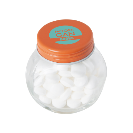Bonbonglas mini mit ca. 40 g Pfefferminzbonbons, farbiger Deckel