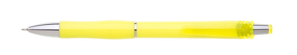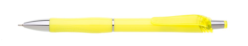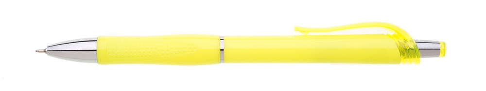 Kunststoff Kugelschreiber in neon gelb und silbernen accessoires. Grip in Farbe des Kugelschreibers ist zum Teil gummiert. Blauschreibende Mine X20.