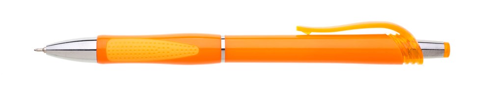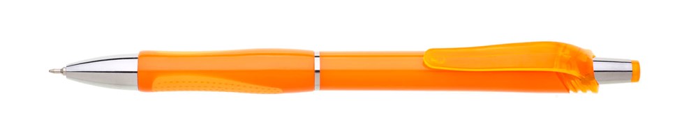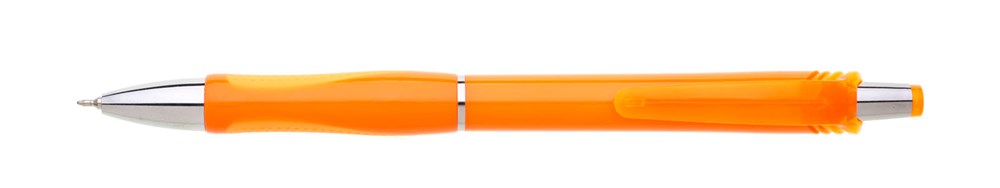 Kunststoff Kugelschreiber FLORI in neon orange und silbernen accessoires. Grip in Farbe des Kugelschreibers ist zum Teil gummiert. Blauschreibende Mine X20.