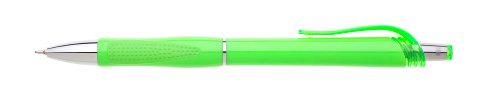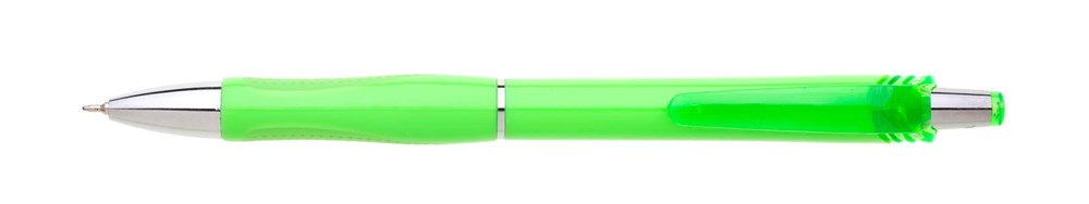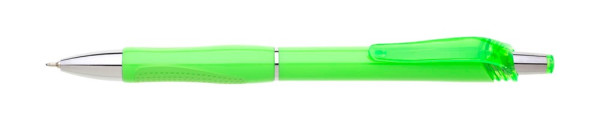 Kunststoff Kugalschreiber in neon grün und silbernen accessoires. Grip in Farbe des Kugelschreibers ist zum Teil gummiert. Blauschreibende Mine X20.