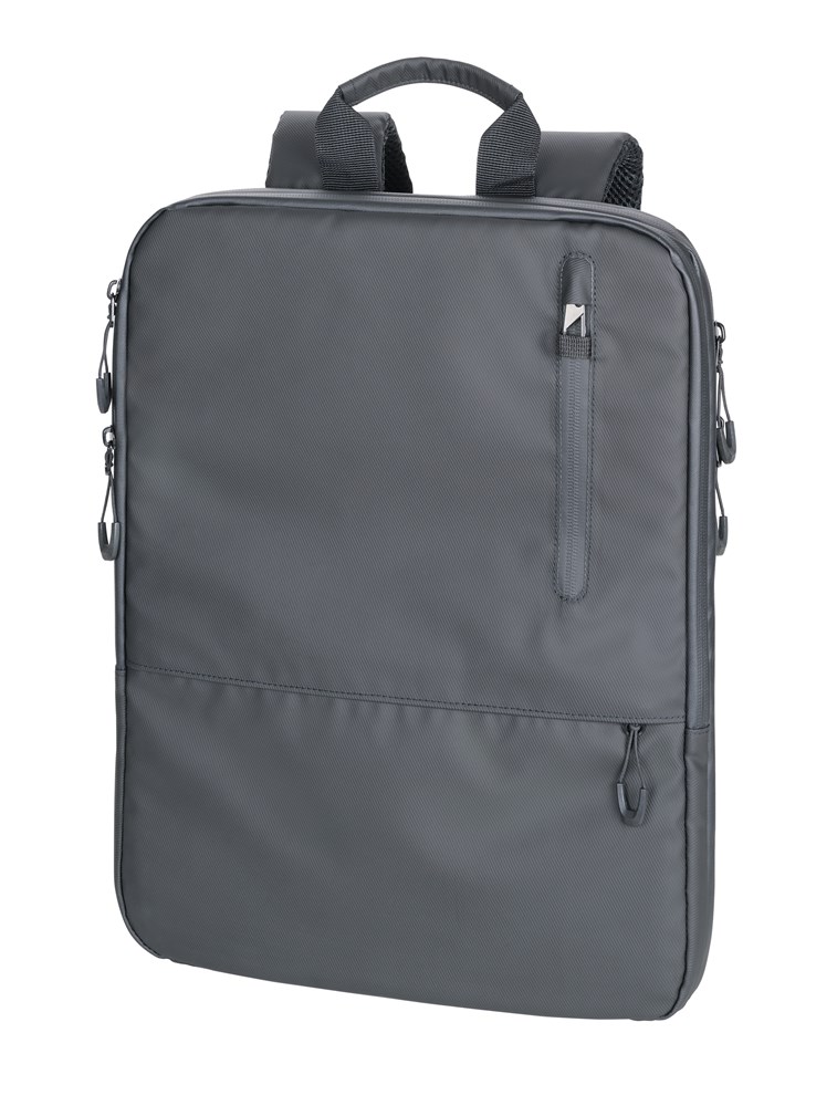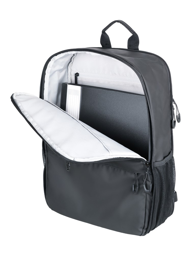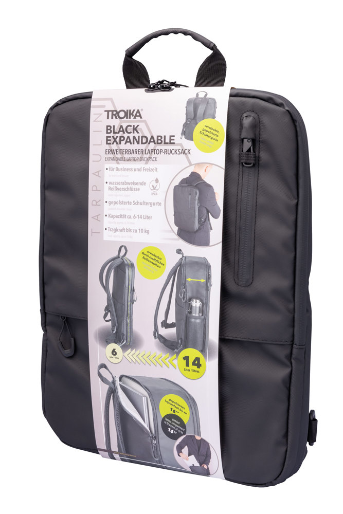 Laptop-Rucksack mit 2 großen Fächern (gepolstertes Laptopfach bis 16'' und Hauptfach) mit 2-Wege Reißverschluss, erweiterbar durch zusätzlichen Reißverschluss, 1 Fronttasche mit versteckbarem Reißverschluss-Schieber als Mini-Karabiner (Diebstahlschutz) + zusätzliches Frontfach, expandiert 2 Netztaschen für Flasche und Schirm, verstärkter Standboden, Schlaufe zur Befestigung am Trolley, Tragegriff, versteckte Rucksackgurte, wasserabweisende Reißverschlüsse außen, widerstandsfähiges Material, spritzwassergeschützt (Wasserdichtheitsgrad IPX4), Kapazität von ca. 6 Liter auf ca. 14 Liter erweiterbar, Tarpaulin: 80% Polyester, 20% Polyurethan (PU), Polyester, Polyurethan, Tarpaulin (Plane), schwarz
