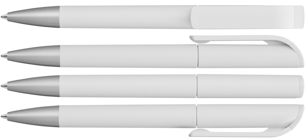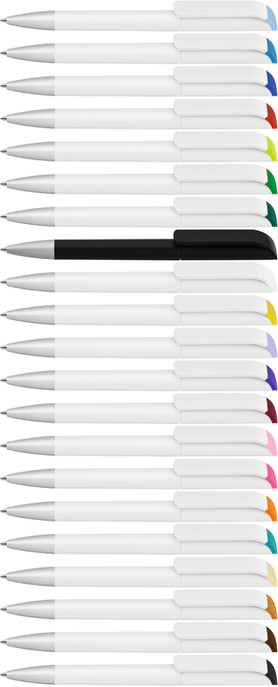 Drehkugelschreiber mit gedeckt mattem Gehäuse in weiß, farbig glänzendem Stopfen und Spitze silber matt.