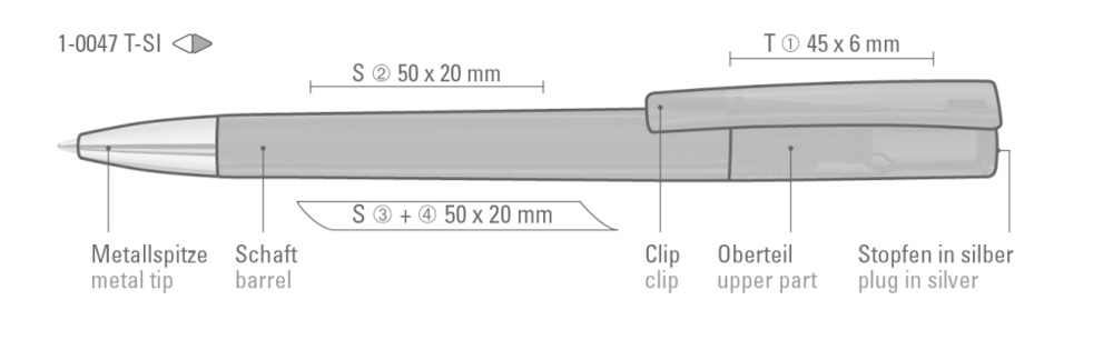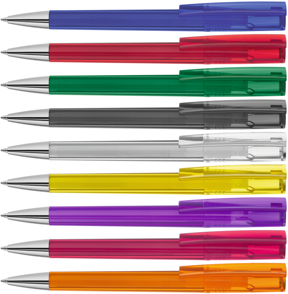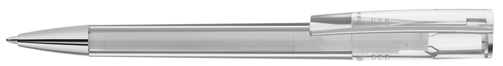 Drehkugelschreiber mit transparent glänzendem Gehäuse und silbernem Stopfen im Oberteil. Schwere Metallspitze glanzverchromt.