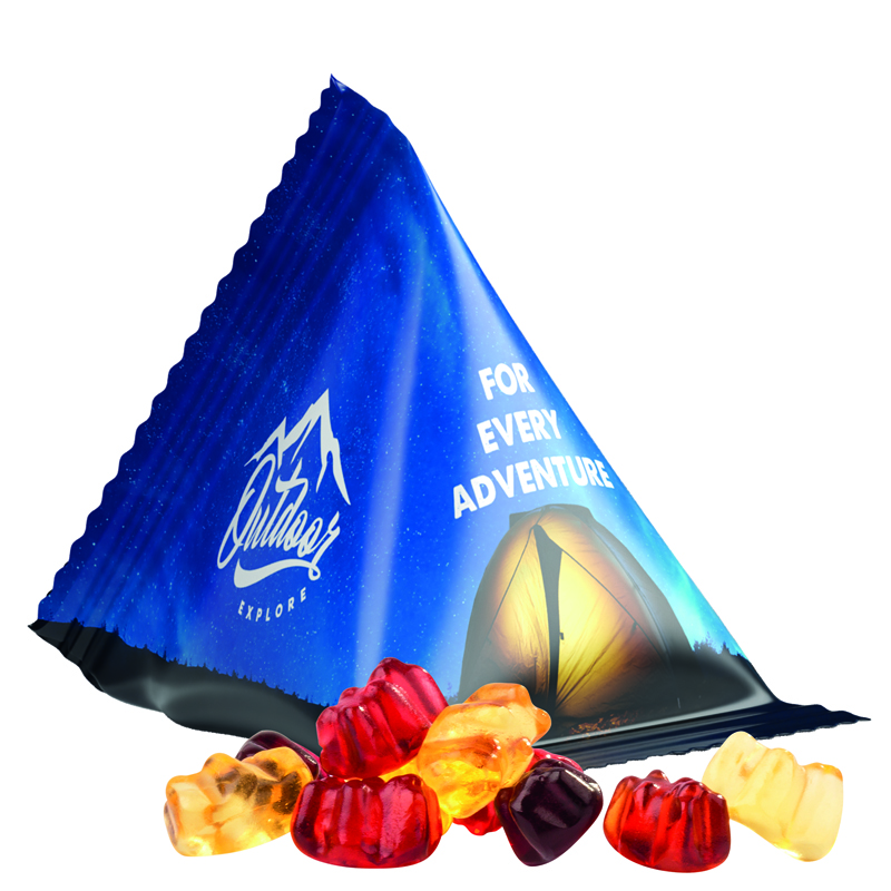 Trolli Gummibärchen im Tetraeder aus weißer Folie, individuell bedruckt. Inhalt: Trolli Gummibärchen in Fruchtsaftqualität Exquisit mit 30 % Fruchtsaftanteil, bunt gemischt, 15 g