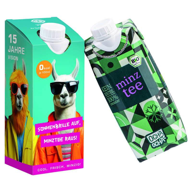 Werbeverpackung aus weißem Karton, individuell bedruckt. Inhalt: 1 recycelbares Tetra Pak® mit Ocha-Ocha® BIO Minztee, 0,5 l im Tetra Pak® recycelbare, pfandfrei, 500 g