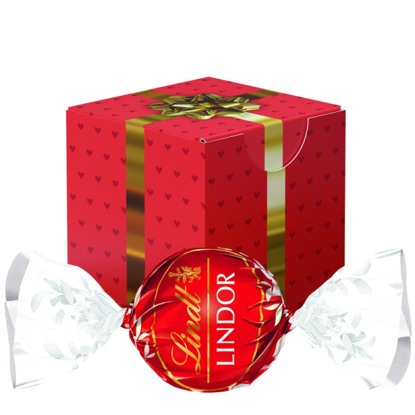 Würfelförmige Werbebox aus weißem Karton, Box individuell bedruckt. Inhalt: 1 Lindt LINDOR... mehr