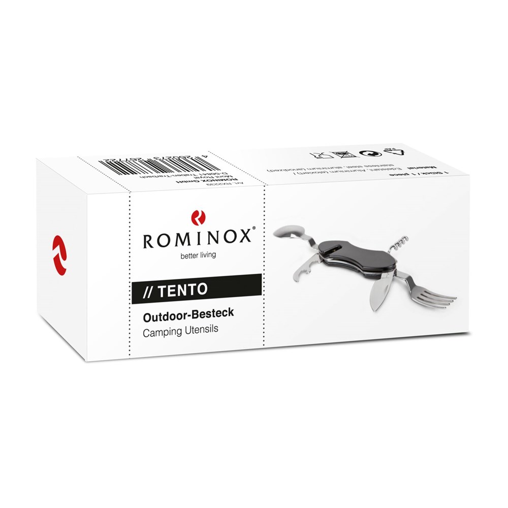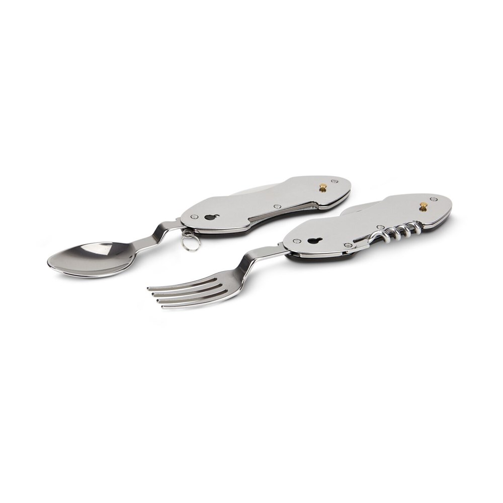 Praktisches Camping-Taschenmesser mit 6 Funktionen für unterwegs: Messer, Gabel, Löffel, Korkenzieher, Dosen- und Flaschenöffner, platzsparender und robuster Reisebegleiter, einfach auseinander- und zusammenzubauen (Edelstahl, Aluminium)