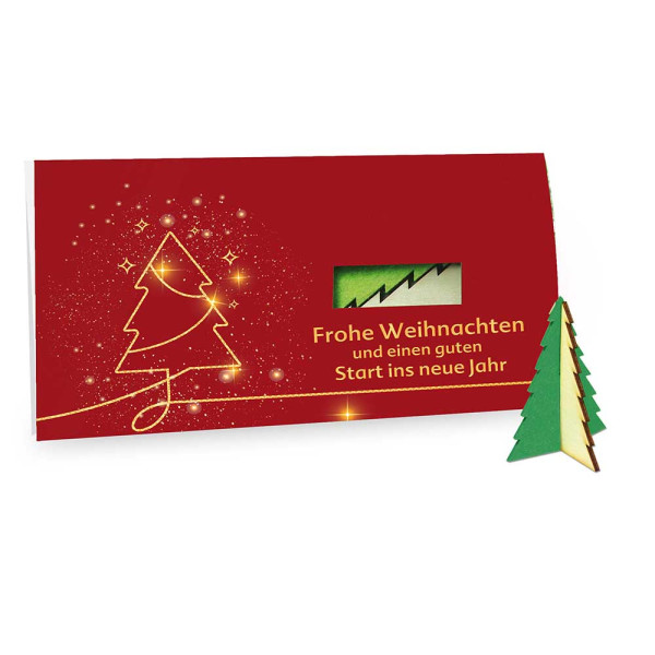 Zusammen basteln: Im Inneren der Karte liegen plano die Teile der jeweiligen Figur, die mit einfachen Handgriffen zusammengesteckt werden. Die Figuren bestehen aus Holz und Filz und sind als Elch, Baum, Stern, Engel, Weihnachtsmann, Wichtel, Kerze, Tannenbaum mit Wendelfilz, Schneemann und Schlitten erhältlich. Die Karte ist mit einer Standardgestaltung versehen. DIN lang Umschläge sind optional möglich.