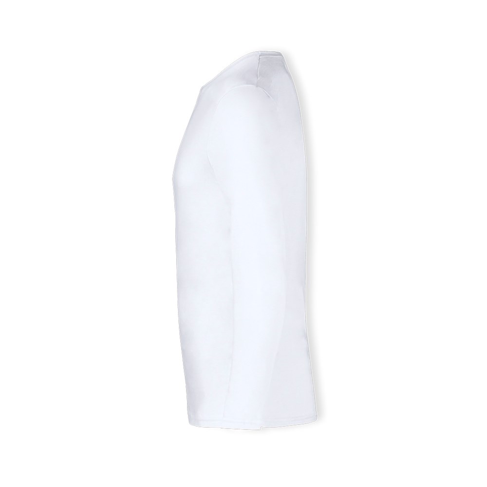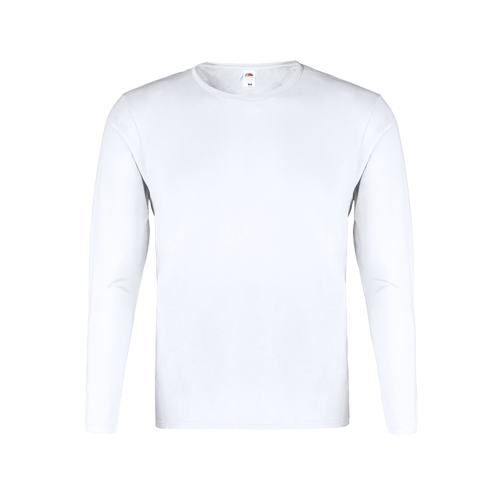 Weißes T-Shirt für Erwachsene Iconic Long Sleeve von Fruit Of The Loom. Hergestellt aus 100% gebürsteter Ringspinn-Baumwolle 140g/m2. Weiches Material und klassischer Schnitt, mit schmalem 1x1 geripptem Rundhalsausschnitt und passender Knopfleiste. Leicht abnehmbares Etikett und erhältlich in den Größen S, M, L, XL, XXL.