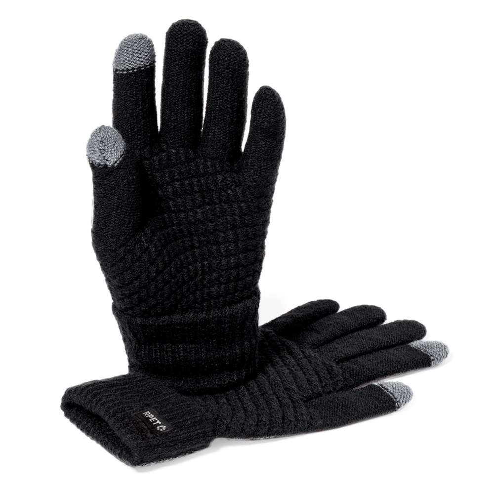 Praktisches Paar Handschuhe für Touchscreen-Geräte. Hergestellt aus warmem, weichem RPET-Polyester-Finish. Touch-Funktion an Zeigefinger und Daumen. Einheitsgröße für Erwachsene, mit RPET-Embleem auf dem Außenetikett.Das RPET-Material wird aus recyceltem Kunststoff hergestellt, um die Wiederverwendung von Kunststoffabfällen zu fördern und die Nachhaltigkeit unseres Planeten zu unterstützen.