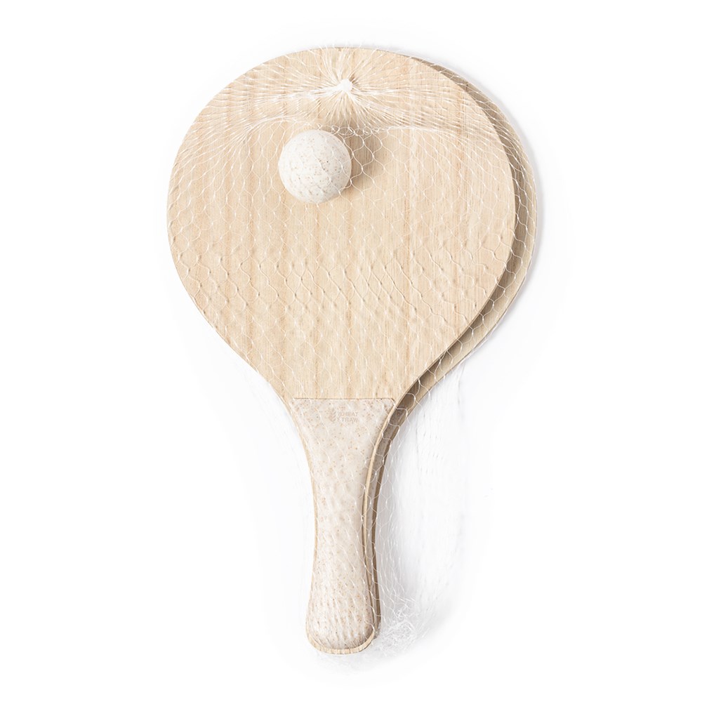 Ein Paar Strandschläger speziell für den Sublimationsdruck. Aus Holz, mit verstärktem Griff aus Weizenstroh. Mit Weizenstroh-Logo auf dem Griff und in einem Netzbeutel und mit einem Ball aus Weizenstroh präsentiert.Weizenstroh fördert die Verwendung natürlicher Rohstoffe und reduziert so die Schadstoffemissionen.