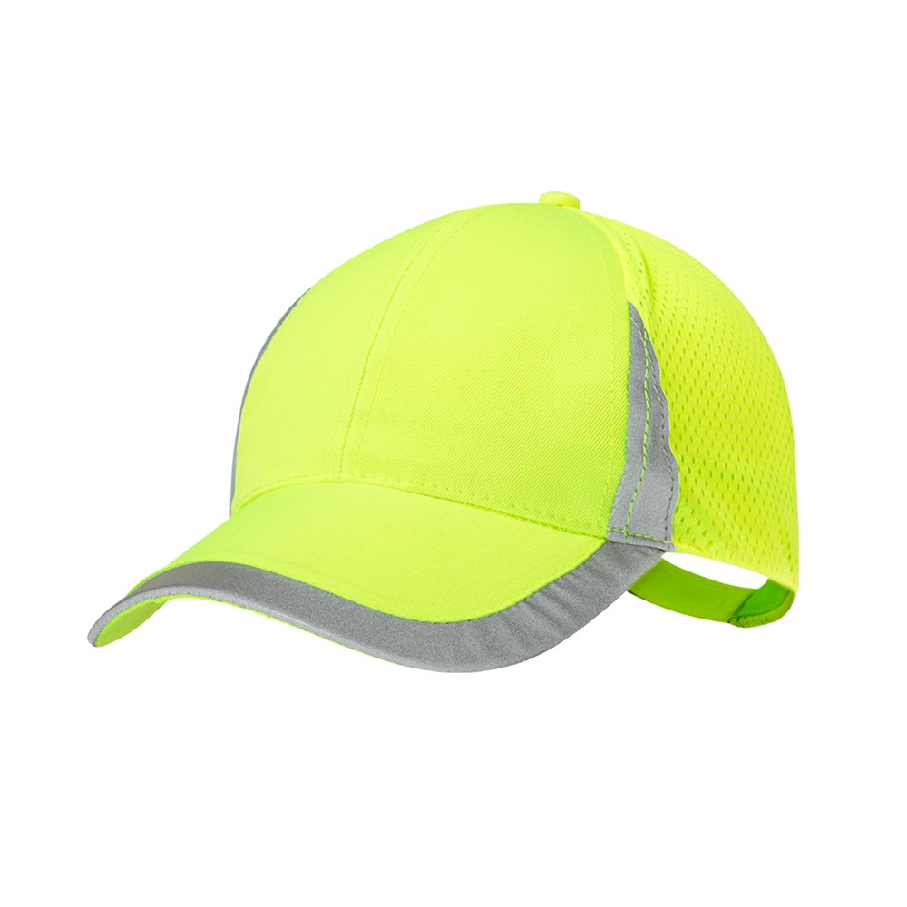 Sportmütze aus weichem Polyester. Verstellbarer Klettverschluss und atmungsaktiver Netzrücken. In fluoreszierendem Gelb mit reflektierenden Details an Schirm, Front und Verschluss.
