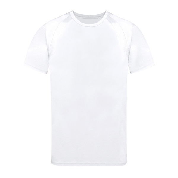 Technisches T-Shirt für Erwachsene aus 100% atmungsaktivem Polyester 135g/m2. Mit Ranglan-Ärmeln, Rundhalsausschnitt und Front- und Seitenstreifen aus atmungsaktivem, mikroperforiertem Gewebe. Erhältlich in den Größen S, M, L, XL, XXL.