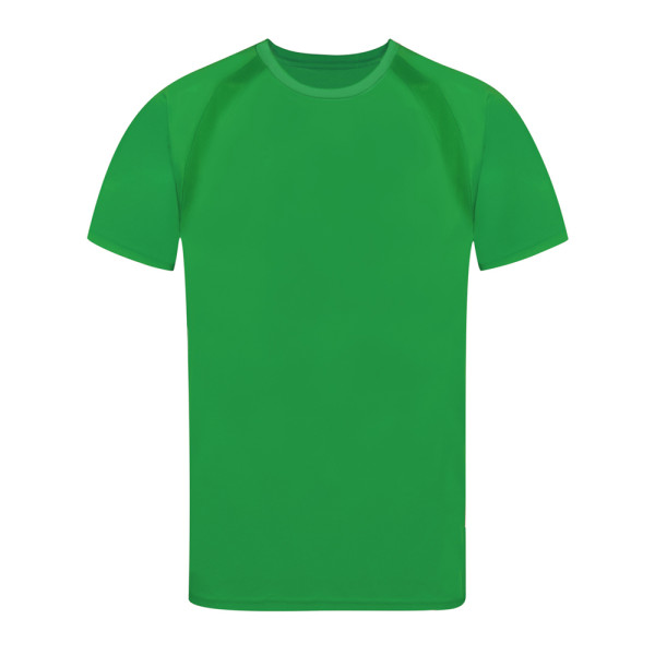 Technisches T-Shirt für Erwachsene aus 100% atmungsaktivem Polyester 135g/m2. Mit Ranglan-Ärmeln, Rundhalsausschnitt und Front- und Seitenstreifen aus atmungsaktivem, mikroperforiertem Gewebe. Erhältlich in den Größen S, M, L, XL, XXL.