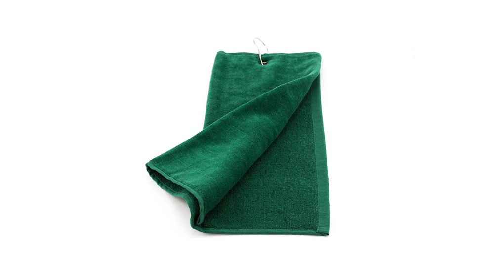 Golf-Handtuch mit den Maßen 40 x 50 cm aus weicher, saugfähiger Baumwolle von hoher Qualität (650 g/m2). Mit Edelstahl-Öse und Befestigungskarabiner.