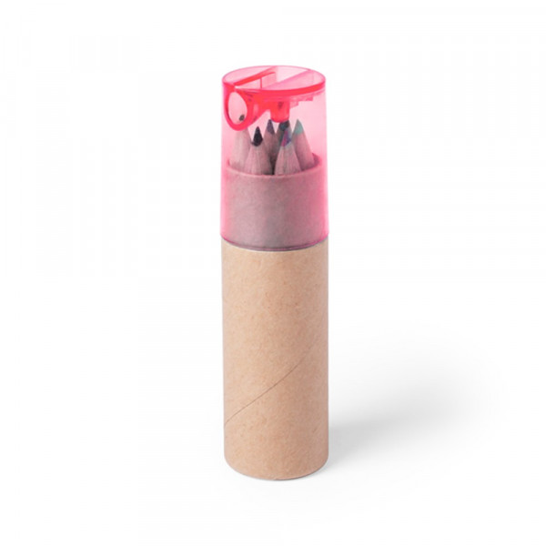 7-teiliges Set in einer zylinderförmigen Box aus Naturkarton mit transparentem Deckel in verschiedenen Farben. Enthält 6 Buntstifte mit sechseckigem Schaft in Naturfarbe und einen im Deckel integrierten Anspitzer.
