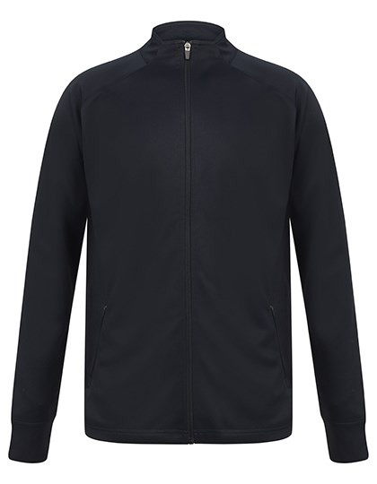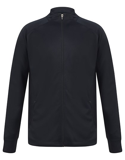 Sportanzugjacke aus Strickgewebe mit kontrastfarbenen äußeren Ärmeleinsätzen | Kontrastfarbener Front-Reißverschluss | Seitliche Taschen mit Reißverschluss | Trichterkragen und Elastische 1x1 Bündchen | Feststellschieber an allen Reißverschlüssen