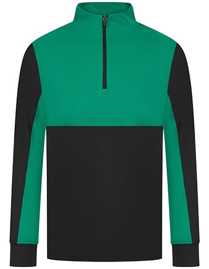 Kontrastierende Einsätze oben an der Brust und an den Ärmeln in Kontrastfarben | 1/4-Reißverschluss | Seitenblenden | Nylon-Reißverschlüsse auf der Rückseite an den mittleren Vorder- und Seitentaschen | 1x1-Ripp-Ärmelbündchen | Halbautomatischer Reißverschluss-Zipper