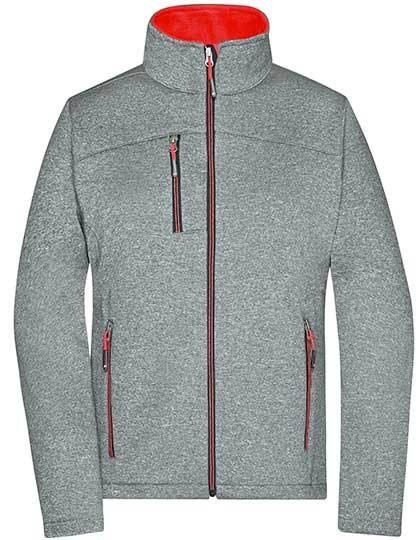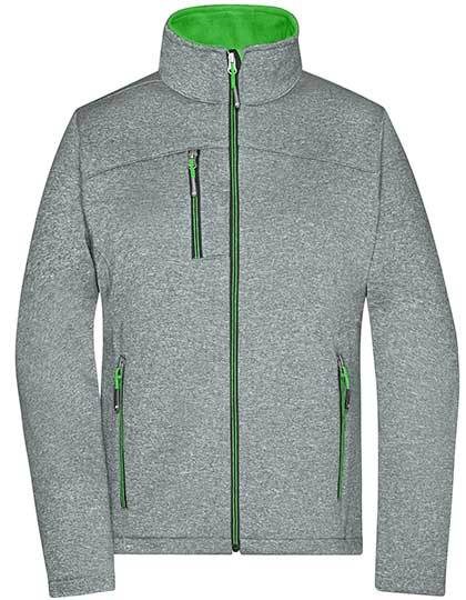 Softshelljacke in Melange-Optik | Angenehmes, weiches, 2-lagiges Softshellmaterial | Fleece-Innenseite in Kontrastfarbe | Durchgehend hinterlegter Front-Reißverschluss mit Kinnschutz | Stehkragen | Zwei seitliche Taschen und eine Brusttasche mit Reißverschluss | Leicht taillliert