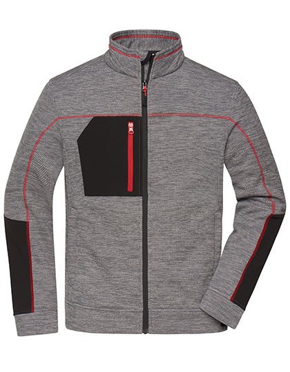 80% recyceltes Polyester | Pflegeleichte Strick-Fleecejacke für Arbeit und Freizeit | Weiches, wärmendes, pflegeleichtes Material in Melange-Optik | Außenseite: glatte, strukturierte Optik | Innenseite flauschig weich angeraut | Zwei Seitentaschen mit verdecktem Reißverschluss, Zwei Innentaschen | Brusttasche aus Webstoff mit kontrastfarbigem Reißverschluss | Kontrastnähte | Stehkragen | Durchgehender, hinterlegter Reißverschluss mit Kinnschutz | YKK-Reißverschlüsse