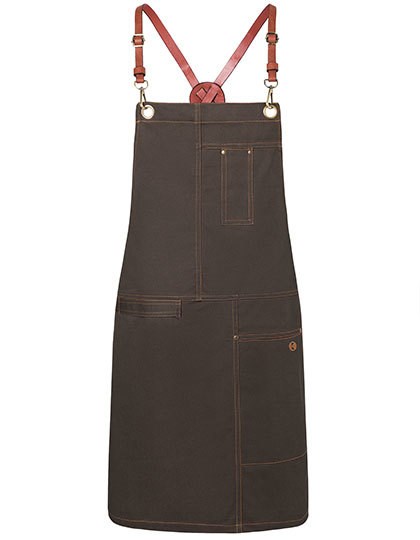 Köpergewebe, 273 g/m² | Waschecht | Latzschürze in Twill-Optik mit Kreuzträgern zur Entlastung des Nackens | Einfaches Abnehmen und Befestigen aller Bänder mit Hilfe von Karabinerverschlüssen | Stufenloses Einstellen der Länge durch Schnallen | Zusätzliches Taillenband zum Regulieren der Weite | Bronzierte Nieten und kontrastfarbige Steppnähte | Funktionale Bänder aus Echtleder | Praktische Stoffschlaufe auf der rechten Seite zum Befestigen eines Kassierhalfters oder Geschirrtuchs | Linksseitige Tasche (16 x 24 cm) und Stiftfach auf Brusthöhe | Bis 60 °C waschbar