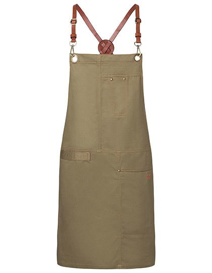 Köpergewebe, 273 g/m² | Waschecht | Latzschürze in Twill-Optik mit Kreuzträgern zur Entlastung des Nackens | Einfaches Abnehmen und Befestigen aller Bänder mit Hilfe von Karabinerverschlüssen | Stufenloses Einstellen der Länge durch Schnallen | Zusätzliches Taillenband zum Regulieren der Weite | Bronzierte Nieten und kontrastfarbige Steppnähte | Funktionale Bänder aus Echtleder | Praktische Stoffschlaufe auf der rechten Seite zum Befestigen eines Kassierhalfters oder Geschirrtuchs | Linksseitige Tasche (16 x 24 cm) und Stiftfach auf Brusthöhe | Bis 60 °C waschbar