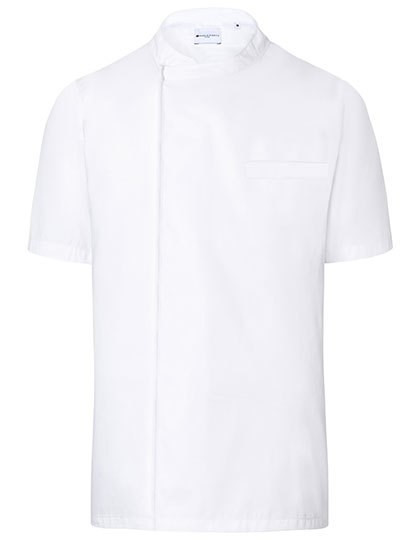 Vorderseite: Köpergewebe, 65% Polyester / 35% Baumwolle, 200 g/m² | Rückseite: Jersey, 100% Polyester, atmungsakitv, feuchtigkeitsregulierend | Modernes Kurzarm-Kochhemd zum einfachen Überziehen | Rückeneinsatz aus Jersey-Gewebe (Netzstruktur) sorgt für hohe Bewergungsfreiheit und angenehme Belüftung | Gerade geschnitten | Verdeckte Knopfleiste mit Druckknöpfen | Öffnen der Druckknöpfe vergrößert den Hemdenumfang und ermöglicht ein einfaches Einschlupfen | Leistentasche auf linker Brustseite | Linker Ärmel mit Leistentasche