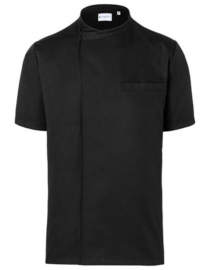 Vorderseite: Köpergewebe, 65% Polyester / 35% Baumwolle, 200 g/m² | Rückseite: Jersey, 100% Polyester, atmungsakitv, feuchtigkeitsregulierend | Modernes Kurzarm-Kochhemd zum einfachen Überziehen | Rückeneinsatz aus Jersey-Gewebe (Netzstruktur) sorgt für hohe Bewergungsfreiheit und angenehme Belüftung | Gerade geschnitten | Verdeckte Knopfleiste mit Druckknöpfen | Öffnen der Druckknöpfe vergrößert den Hemdenumfang und ermöglicht ein einfaches Einschlupfen | Leistentasche auf linker Brustseite | Linker Ärmel mit Leistentasche