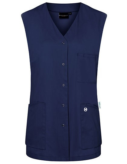 Köpergewebe, 150 g/m² | Waschecht, pflegeleicht, nachhaltig | Damenkasack ohne Ärmel und mit V-Ausschnitt | Polyesteranteil aus recyceltem Plastik | Besonders leichter Stoff für ein angenehmes Tragegefühl im Berufsalltag | Waschbarkeit bei 95°C | Leicht tailliert geschnitten | 2 aufgesetzte Seitentaschen mit verdeckter Innentasche rechts | 1 Schlaufe in der Seitentasche zur Anbringung einer Schlüsselkette | 1 aufgesetzte Brusttasche links mit Stiftfach | 5 zentrale Druckknöpfe zum Verschließen des Kasack | Grüner Knopf zertifiziert, www.g-k.eu/karlowsky