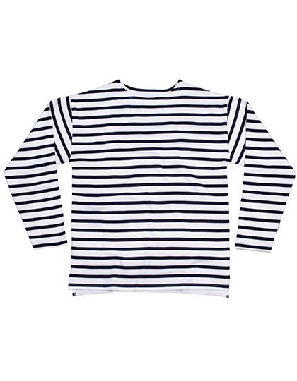 Zertifizierung als Bio-Baumwolle in Arbeit | Unisex | Überschnittene Schultern | 0,8 und 1,6 cm breite, garngefärbte Streifen | Seitenschlitze | Länger geschnittener Rücken | Weiche und dehnbare Qualität | Abreißetikett