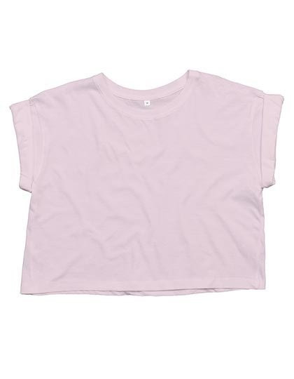Lockeres, bauchfreies Rundhals T-Shirt | Bio-Baumwolle, ringgesponnen und gekämmt | Fallende Schulterpartie mit aufgerollten Ärmeln | Saum mit Zwillingsnadel | 1x1 Ripp-Kragen | Abreißbares Größenetikett