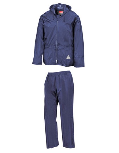 Wind- und wasserdicht (2.000 mm) | Außen: 190T 100% Polyester mit StormDri 2000 Beschichtung | Schweres Material, versiegelte Nähte | Kapuze mit Klettverschluss, durchgehender Reißverschluss vorne | Zwei geräumige Taschen an der Vorderseite der Jacke und zwei Eingriffe zu den Taschen der darunter getragenen Hose | Innenliegende Bündchen, Rückseite mit Netzlüftung | Verstellbarer Kordelzug im Bund der Jacke | Elastischer Hosenbund | Beinabschluss verstellbar durch Druckknopf | Reißverschluss-Beutel zum Verstauen | Sicherheitsdreiecke vorne und hinten mit reflektierenden Materialien