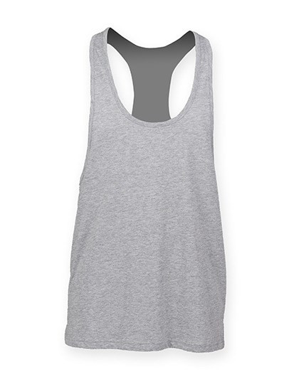 Single Jersey | Racerback | Lang geschnitten | Abgesetzte Einfassung des Halsausschnitts und der Armlöcher | Gerader Saum mit Doppelnaht | Abreißetikett